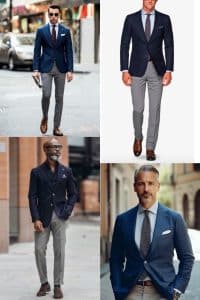 Outfit: A tailored navy blazer paired with a crisp white Oxford shirt, grey wool trousers, and brown leather loafers.