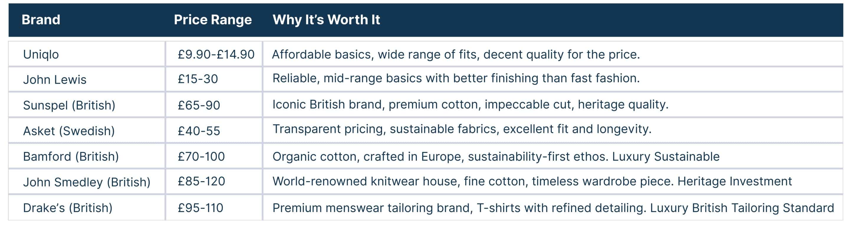Fast fashion white T-shirts (£5–10): Cheap and accessible, but the quality shows. They lose shape, collars sag, and the fabric thins after just a few washes.